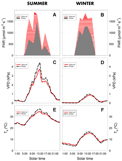 During night-time hours, Ta values were similar in both cropping conditions in summer (Figure 1A and Figure 2E), although there were some differences in the winter, when Ta was lower (≈1.5 °C) in shaded than in open-air conditions (Figure 1C and Figure 2F). A slight decrease in the air temperature (0.4 °C) during the night hours was noted under anti-hail black netting [27]. However, no differences were noted in VPD values between cropping conditions at this time in either season (Figure 2C,D).