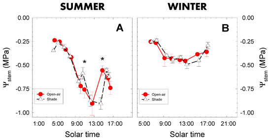 Diurnal course of stem water potential (Ψstem) on representative days of summer (9 August 2018; A) and winter (13 February 2019; B) in lime trees grown in open-air (closed symbols) and shaded (open symbols) conditions. Each point is the average of four replications. Vertical bars represent ± standard error (SE). Asterisks indicate statistically significant differences between cropping conditions at * p ≤ 0.05.