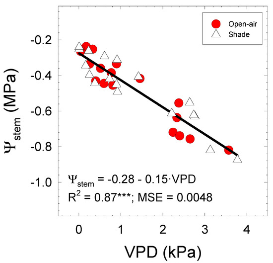 Relationship between daily stem water potential (Ψstem) and vapour pressure deficit (VPD) values in lime trees grown in open-air (closed symbols) and shaded (open symbols) conditions on the two measurement days. Each point is the average of four replications. *** p ≤ 0.001. MSE = mean squared error.