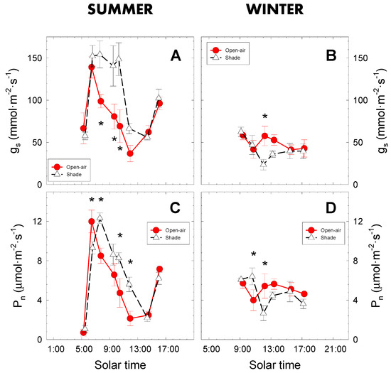 Diurnal course of stomatal conductance (gs) and net photosynthesis (Pn) on representative days of summer (9 August 2018; A,C) and winter (13 February 2019; B,D) in lime trees grown in open-air (closed symbols) and shaded (open symbols) conditions. Each point is the average of four replications. Vertical bars represent ± standard error (SE). Asterisks indicate statistically significant differences between cropping conditions at * p ≤ 0.05.