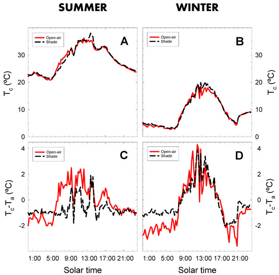 Diurnal course of canopy temperature (Tc) and canopy-to-air temperature difference (Tc − Ta) on representative days of summer (9 August 2018; A,C) and winter (13 February 2019; B,D) in lime trees grown in open-air (solid line) and shaded (dashed line) conditions. Lines are the 15-min average values of two replications.