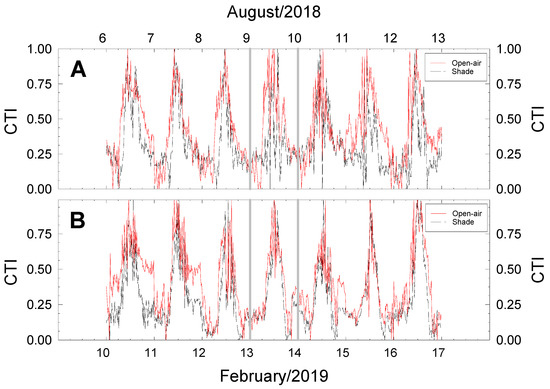 The integrated daily CTI values (∑24hCTI) were 7.24 and 10.00 for shaded and open-air trees, respectively, on the above mentioned day in summer, and 7.56 and 8.93 in winter. This behaviour was maintained when the weekly data in Figure 7 were analysed, statistically significant differences between cropping conditions being evident: an average ∑24hCTI of 7.57 ± 0.44 and 10.02 ± 0.39 for shaded and open-air trees in August, and 7.04 ± 0.36 and 9.49 ± 0.75 in February, respectively.