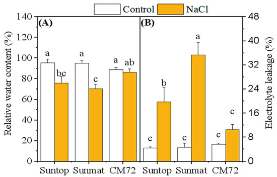 Relative water content (A) and electrolyte leakage percentage (B) in leaves of two wheat cultivars—Suntop and Sunmate—and one barley cv. CM72 after 7 days of exposure to 100 mM NaCl. Control and NaCl represent 0 and 100 mM NaCl, respectively. Values are means ± SD (n = 4). Different letters indicate a significant difference (p ≤ 0.05) between NaCl treatment and control within each wheat and barley cultivar.