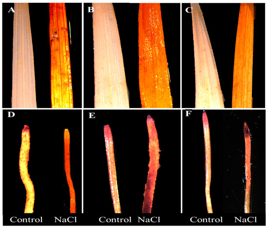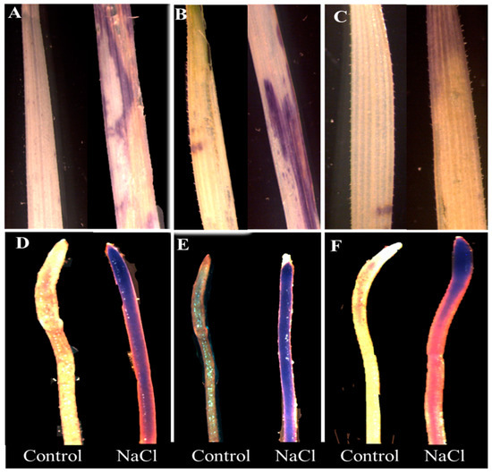Histochemical detection of H2O2 by NBT (nitro-blue tetrazolium) staining in leaves (top row) and roots (bottom row) of two wheat cultivars—Suntop (A,D), Sunmate (B,E)—and barley cultivar CM72 (C,F). The samples were collected after 7 days of 100 mM NaCl treatment.