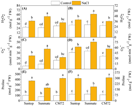 Salinity induced significantly higher accumulation of ROS (H2O2 and O2–), but both H2O2 and O2– content in leaves varied with the tested cultivars (Figure 4). Barley cultivar CM72 had the lowest induced accumulation of H2O2 (+39%, NaCl vs. control), followed by Suntop (+61%) and the highest in Sunmate (+93%) in comparison with their respective controls. In roots, a similar trend was found with H2O2 content being 84%, 42%, and 35% higher in Sunmate, Suntop, and CM72, respectively, under NaCl stress. An increased O2– concentration was also observed for all the tested cultivars under NaCl treatment; however, CM72 appeared to have the least elevated O2– in both tissues. Salinity stress increased the proline content in leaves and roots of both species (Figure 4E,F). It elevated much more significantly in both leaves and roots of Suntop and CM72, but the absolute content and increased amount were comparable.