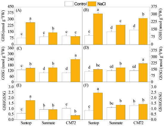 Upon 100 mM NaCl stress, the GSH contents of the leaf and root were significantly increased except leaves in CM72. The increased amount of GSH content in leaves was in the order Suntop > Sunmate > CM72, and, in roots, it was Suntop > CM72 > Sunmate. GSSG contents in both leaves and roots increased under treatment; however, the increased amount over the control was in the order CM72 > Sunmate > Suntop in both plant tissues (Figure 5A–D). As a result, the increased GSH/GSSG ratio was only recorded in both leaves and roots of Suntop under stress (Figure 5E,F).