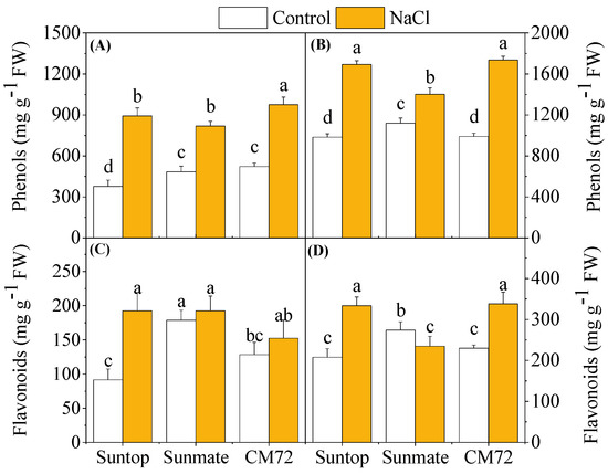 As shown in Figure 6, the content of phenolics and flavonoid was significantly increased (p < 0.05) in both roots and leaves of Suntop and CM72 under NaCl stress. Phenolics content in leaves and roots of Sunmate behaved the same as the other cultivars but exhibited less extent of the increase. Flavonoid content remained unchanged in leaves of Sunmate but reduced in its roots under 100 mM NaCl.