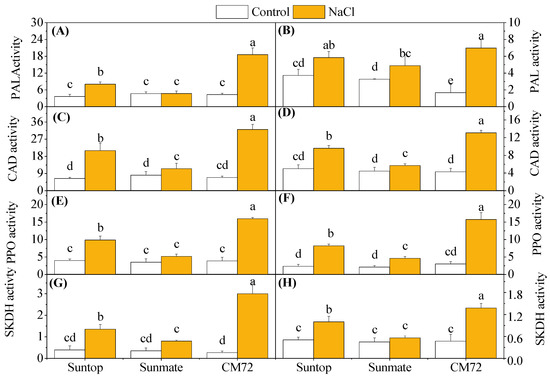 Figure 7A–H shows PAL, PPO, CAD, and SKDH contents in the leaves and roots of wheat and barley plants when grown with and without 100 mM NaCl. The activity of PAL in leaves and roots of CM72 was significantly increased under 100 mM NaCl. This also occurred in wheat cultivar Suntop, despite the extent of the increase being smaller than that observed in CM72. In Sunmate, the activity of PAL was increased only in roots under NaCl treatment (Figure 7A,B).