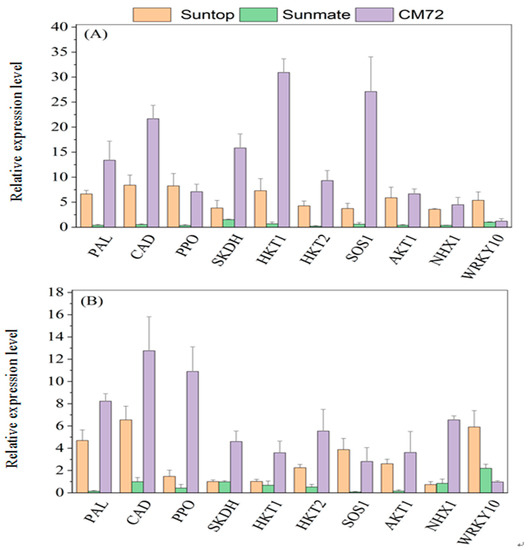 Relative expression levels (100 mM NaCl vs. control) of secondary metabolites-related genes, transporter and sequestration genes, and transcription factors in leaves (A) and roots (B) of Suntop, Sunmate, and CM72 under 100 mM NaCl. Seedlings were exposed to 100 mM salinity (NaCl) treatments for 7 days. Data are means ± SD (n = 3).