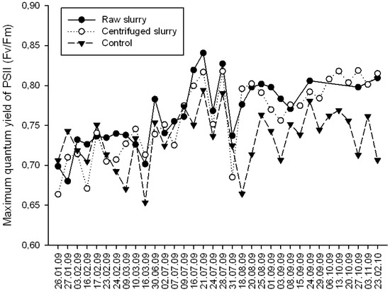 The species irrigated with pig slurry showed higher Fv/Fm values than the species irrigated with tap water. For the species irrigated with pig slurry the Fv/Fm values reach 0.840 and 0.818 for the raw and the centrifuged slurry, respectively. These values were close to the maximum value for a plant quantum yield, i.e., 0.842 [33]. These results reveal that all the bamboos were in a growth state during the experiment and were not limited by any stress. All the three curves followed the same variations during the experiment; these variations were caused by the change in environment conditions, especially the air temperature that can affect the photosynthetic system [34,35,36]. At the beginning of the fluorescence measurements (January) the bamboo species planted on the three plots were irrigated only with tap water. During this period the Fv/Fm values were similar between species. After the pig slurry supply at high rates (July 2009), an increase of the Fv/Fm values was observed for the two pig slurry plots. Between the beginning and the end of the experiment the species’ Fv/Fm values increased from 0.699 up to 0.810 for the raw slurry treatment and 0.664 up to 0.815 for the centrifuged slurry treatment. These results indicate an improvement of the photosynthetic apparatus due to the increase in nutrient supply. These results comply with the increase in leaves nitrogen content for the species planted in the two pig slurry treatments compared to the control. Several studies have demonstrated that the photosynthetic activity is positively correlated to the nitrogen content in leaves [37,38]. The species planted on the control plot showed an average nitrogen content in leaves of 26 g·kg−1 DM. This result corresponds to the nitrogen content that can be found in a natural bamboo forest [39,40,41]. The nitrogen content for the raw slurry and centrifuged slurry were 33.5 and 33.6 g·kg−1 DM, respectively, values that are higher than 3% of the dry mass, the maximum nitrogen content recommended by Kleinhenz et al. [26] for optimal biomass yield of bamboo.