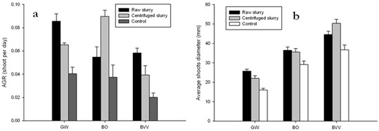 All species showed an increase of the mean shoot diameter with the raw and centrifuged slurry treatment, compared to the control (p < 0.001) (Figure 2b). For the species GW the average shoot diameter increased from 16 millimeters for the control, to 25 and 21 millimeters for the raw slurry and centrifuged slurry treatment, respectively. For the species BO, the average shoot diameter increased from 29 millimeters for the control, to 36 and 35 for the raw slurry and centrifuged slurry treatment, respectively. For the BVV species the average shoot diameter increased from 36 millimeters for the control, to 44 and 50 millimeters for the raw slurry and centrifuged slurry treatment, respectively. The average shoot diameter was increased by 24%, 21% and 60% for the species BO, BVV and GW, respectively with the raw slurry treatment, compared to the control and by 21%, 36% and 36% for the species BO, BVV and GW, respectively, with the centrifuged slurry treatment, compared to the control. The mean number of shoot increase differed between the species (p < 0.001). The species GW and BO showed larger diameter for the raw slurry treatment than with the centrifuged slurry treatment. On the contrary the species BVV show larger diameter for the centrifuged slurry treatment than with the raw slurry treatment. The species BVV show the largest shoot diameter for all the three treatments.