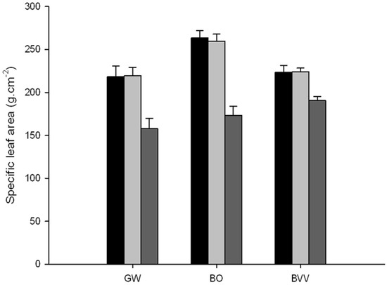 The Specific Leaf Area (SLA) increased significantly for the two pig slurry treatments, compared to the control (p < 0.001) (Figure 3). For the species GW, the SLA increased from 157 for the control, to 218 and 219 g·cm−1 with the raw slurry and centrifuged slurry treatment, respectively. For the species BO the SLA increased from 173 for the control to 223 and 259 g·cm−1 with the raw slurry and centrifuged slurry treatment, respectively. For the species BVV the SLA increase from 190 for the control to 223 and 224 g·cm−1 with the raw slurry and centrifuged slurry treatment, respectively. On the whole, the increase of SLA is nearly the same for the two pig slurry treatments compare with control and was about 17% for BVV, 38% for GW, 50% for BO.