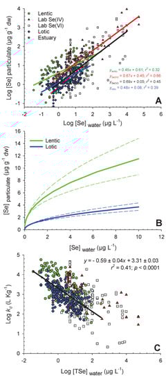 Panel (A) shows log-transformed selenium concentrations in particulate (Log [Se]particulate; µg g−1 dw) as a function of log-transformed water total dissolved selenium concentrations (Log [TSe]water; µg L−1) for lentic (green circles; n = 110), estuary (gray stars; n = 8), lotic (blue diamond; n = 195), selenate (white squares; n = 162), and selenite studies in the laboratory (red triangles; n = 94). Regressions are presented except for estuaries and equations are presented in panel A (p-value < 0.0001). Panel (B) shows the same regressions (± dashed standard errors) as in panel A for lentic and lotic systems but on a normal scale at relatively low aqueous Se concentrations (0-10 µg L−1). Panel (C) shows log-transformed partition coefficient (Log kd; L kg−1) as a function of log-transformed water total dissolved Se concentrations (Log [TSe]water; µg L−1) for the same systems as in panel A (see legend in panel A). The regression in panel C is for all field studies.