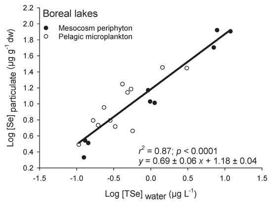 Log-transformed Se concentrations in particulate (Log [Se]particulate; µg g−1 dw) as a function of log-transformed water total dissolved Se concentrations (Log [TSe]water; µg L−1). Closed circles are from periphytic biofilms in mesoscosms spiked with Se(IV) in a boreal lake [45] and the open circles are from pelagic microplankton (<64 µm filtered and centrifuged water) collected in 12 boreal lakes in two mining regions [23]. Note that these are among the highest kds reported in Figure 1C.
