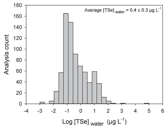 Frequency distribution of log-transformed total dissolved Se concentrations (Log [TSe]water; µg L−1) in water from around the world (n = 775). Average and standard error is presented in the graph.