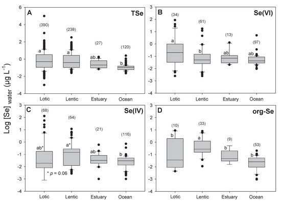 Boxplot of log-transformed (A) total dissolved selenium (TSe), (B) selenate (Se(VI)), (C) selenite (Se(IV)), and (D) organic selenium (org-Se) concentrations in water (µg L−1) for different aquatic systems categories (Lotic, Lentic, Estuary, Oceans (and seas)). Number of samples is presented in parentheses. Significant differences (analysis of variance (ANOVA) followed by Tukey’s test; p < 0.05) are presented by different lower-case letters.