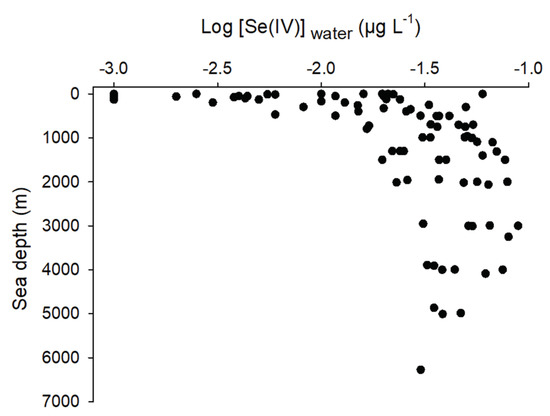 Log-transformed selenite concentrations (Log [Se(IV)]water, µg L−1) as a function of oceans depth (m) from several oceanic cruises (modified from Conde and Sanz Alaejos [21]).