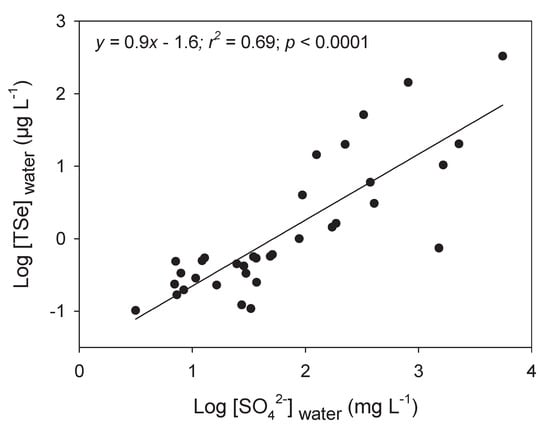 Sulfur shares many similarities with selenium and both elements are present together in many systems, from pyrite to biological systems sharing similar cellular pathways [64]. In Figure 6, we present the relationship between SO42− and [TSe] in freshwaters to acknowledge their close relationship in aquatic systems. Unfortunately, we found few studies with both measurements. Seawater ([SO42− ] > 2500 mg L−1) or water from estuarine systems were not included because of their stable and high SO42− concentrations. Given the high interactions of both elements, studies on Se in the field and the lab should always measure and/or report [SO42−] for risk assessment purposes and to better explain accumulation results (see Section 5.4 and Section 5.6).