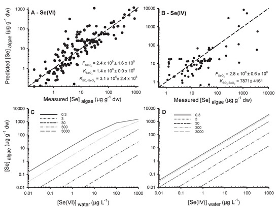 Predicted algae selenium concentrations (Predicted [Se]algae, µg g−1 dw) from the competition model (Equation (12)) of sulfate with (A) selenate (Se(VI)) and (B) selenite (Se(IV)) as a function of measured algae selenium concentrations (Measured [Se]algae, µg g−1 dw). The 1:1 lines and estimated constants (±standard errors) of the model (Equation (12)) have been shown. In (C) are the predicted [Se]algae (µg g−1 dw, Equation (12)) as a function of fictitious selenate concentrations ([Se(VI)]water, µg L−1), (D) selenite concentrations ([Se(IV)]water, µg L−1) and sulfate concentrations (mg L−1; in legend). Note that to use both models with the constants provided, SO42−, Se(IV) and Se(VI) concentrations must be in mol L−1 and the output results are in µg g−1 dw.