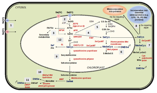 - Novoselov, S.V.; Rao, M.; Onoshko, N.V.; Zhi, H.J.; Kryukov, G.V.; Xiang, Y.B.; Weeks, D.P.; Hatfield, D.L.; Gladyshev, V.N. Selenoproteins and selenocysteine insertion system in the model plant cell system, Chlamydomonas reinhardtii. EMBO J. 2002, 21, 3681–3693. [Google Scholar] [CrossRef] [PubMed]