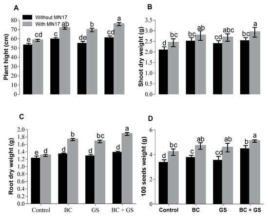 Effects of immobilizing agents (biochar and gravel sand) with and without seed inoculation of Enterobacter sp. MN17 on growth parameters of pea plant under Cd-contaminated soil conditions. Bars sharing the same letters in each graph do not differ significantly at p < 0.05. The values are mean ± S.D. (n = 3). BC: biochar; GS: gravel sand; BC + GS: biochar + gravel sand; MN17: Enterobacter sp. MN17.