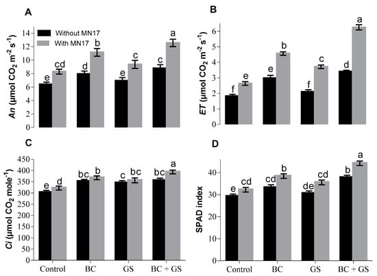 Effects of immobilizing agents (biochar and gravel sand) with and without seed inoculation of Enterobacter sp. MN17 on physiological parameters of pea plants under Cd-contaminated soil conditions. Bars sharing the same letters in each graph do not differ significantly at p < 0.05. The values are mean ± S.D. (n = 3). BC: biochar; GS: gravel sand; BC + GS: biochar + gravel sand; MN17: Enterobacter sp. MN17; An; net assimilation rate, ET; evapotranspiration rate, Ci; internal carbon dioxide concentration, and Soil Plant Analysis Development (SPAD) index.