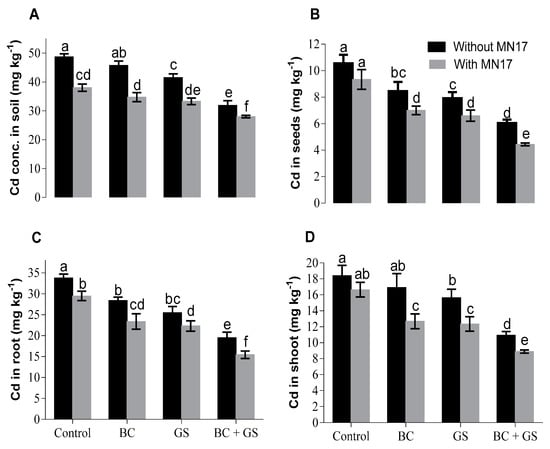 Effects of immobilizing agents (biochar and gravel sand) with and without seed inoculation of MN17 on Cd concentration in soil, seeds, root, and shoot tissues of peas grown in Cd-contaminated soil. Bars sharing the same letters in each graph do not differ significantly at p < 0.05. The values are mean ± S.D. (n = 3). BC: biochar; GS: gravel sand; BC + GS: biochar + gravel sand; MN17: Enterobacter sp. MN17