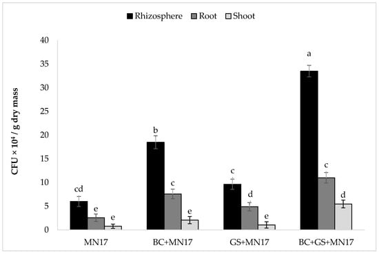 Persistence of the endophytic bacterial strain MN17 in the rhizosphere and presence in roots and shoots extracts of P. sativum grown in Cd-contaminated soil. Bars sharing the same letters do not differ significantly at p < 0.05. The values are mean ± S.D. (n = 3). BC: biochar; GS: gravel sand; BC + GS: biochar + gravel sand; MN17: Enterobacter sp. MN17.