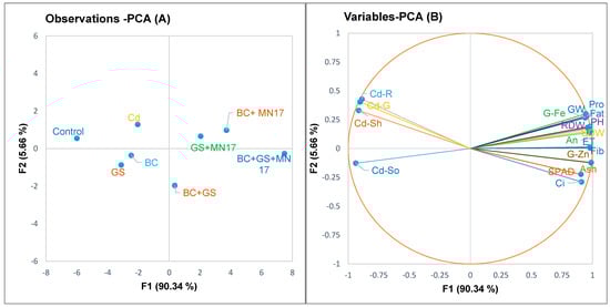 Principal component analysis of observations (left) and variables (right), whereby the first two components revealed 96% of the variability between the applied treatments and studied parameters of pea plant under Cd-stressed soil conditions. Observations are control; BC: biochar; GS, gravel sand; BC + GS, biochar + gravel sand; BC + GS + MN17, biochar + gravel sand inoculated with MN17; PH, plant height; SDW, shoot dry weight; RDW, root dry weight; GW, grains weight; Pro, protein; Fat, fat; Fib, fiber; Ash, ash; G-Fe, Fe concentration in grains; G-Zn, Zn concentration in grains; Cd-So, Cd concentration in soil; Cd-Sh, Cd concentration in shoots; Cd-R, Cd concentration in roots; Cd-G, Cd concentration in grains; Ci, internal carbon dioxide concentration; An, net assimilation rate: ET, evapotranspiration rate, and SPAD, chlorophyll (SPAD) contents.