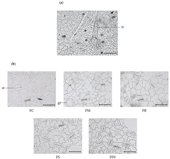Photomicroscopic data of the leaf surface of five Fraxinus plants: (a) epidermal cells are arranged in a rosette around trichome base on the lower surface (F. rhynchophylla) (×400). The black bar means 100 μm; (b) photomicroscopic data of the lower surface of leaves from five plants (×1000). Black bars mean 50 μm; gt, glandular trichome; st, stomata; tr, trichome; FC, Fraxinus chiisanensis; FM, F. mandshurica; FR, F. rhynchophylla; FS, F. sieboldiana; FSV, F. sieboldiana var. angustata.