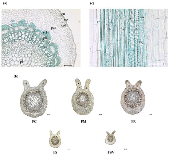 As shown in Figure 2a, the petiole comprised several anatomical elements: a cuticle, epidermis, ground tissues of parenchyma, collenchyma, and sclerenchyma cells, conductive tissues of xylem and phloem, starch grains, and parenchymatous pith etc. The petiole of almost all samples was oval-shaped with a flat adaxial side and altered by two lateral wings, defining a wide and deep ditch. On the two lateral wings of the adaxial portion, there were conductive tissues with a very few sclerenchyma cells at the phloem periphery (Figure 2b). The epidermis had a single line of isodiametric cells with thin cuticles, covered with various numbers of multicellular and rarely unicellular trichomes. FC and FR exhibited larger epidermal cells at the adaxial portion than did other species. Two to three layers of annular-type collenchyma cells in the cortex were observed beneath the epidermis in all samples. FC had a lower ratio of cortex than did the other plants, with the mean value of 0.23 ± 0.03 μm (Table 2). A larger diameter of parenchyma cells in both (adaxial and abaxial) portions occurred in FC with the mean values of 35.3 ± 2.5 and 51.6 ± 4.6 μm, respectively. Sclerenchyma cells were observed at the periphery of the phloem region for all samples with substantial variation. FSV exhibited the highest number of sclerenchyma cells with a mean value of 80.3 ± 3.4 in an area of 300 × 300 μm2, followed by FR with 70 ± 4.7 in the same area. FM and FS displayed similar numbers of sclerenchyma cells with the mean values of 51 ± 3.2 and 54.9 ± 3.0, respectively, and FC had the lowest number of sclerenchyma cells. The stele (phloem and xylem) was made up of numerous libero-ligneous fascicles of collateral type and provided a ring of vascular bundles. Three different types of xylem vessels, consisting of annular, spiral, and pitted vessels, were observed in all samples (Figure 2c). A thin-walled parenchymatous pith region was located at the center of the stele. Moreover, considerable similarity and dissimilarity was occurred in the diameter of parenchyma cells in the pith region. The parenchyma cells of FC had the largest diameter of 81.3 ± 2.6 μm, whereas those of FS and FSV had the smallest diameter in the range of 28.6–40.4 μm (Figure 2b) (Table 2).