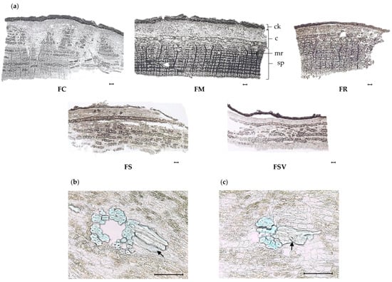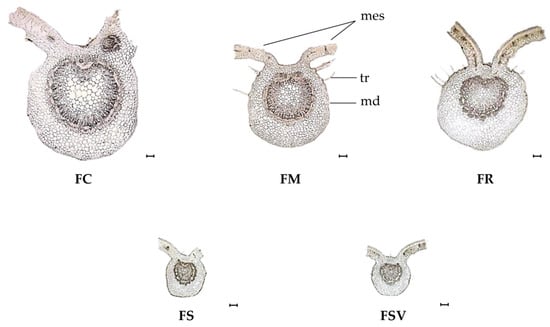 In the transverse section, the midrib was prominent on the abaxial side and the flat ditch was noticeable on the adaxial side for all samples (Figure 3). The mesophyll was dorsiventral and consisted of single or double-layered elongated palisade parenchyma on the upper side and multilayer of lacunose (spongy) tissue on the lower side. The single-layered palisade parenchyma was exhibited by the FC, FS, and FSV, whereas FM and FR had a double layer of that parenchyma. Unicellular, multicellular, and rarely secretory trichomes were observed on the surface of the midrib in all samples. The epidermis of the midrib was formed by a solo line of rectangular to squarish cells. FS and FSV had smaller epidermal cell than did the others (Table 3). The number of sclerenchyma cells displayed a substantial variation in the periphery of the phloem region for all samples. The highest number of sclerenchyma cells was observed in FSV with a mean value of 114.8 ± 18.7 in 300 × 300 μm2, followed by FS and FR with 75.5 ± 17.1 and 70.1 ± 6.5 in 300 × 300 μm2, respectively. FC had the lowest number with a mean value of 38.6 ± 3.0 in 300 × 300 μm2. Large variation among the samples was found for the diameter of parenchyma cells in the abaxial portion and pith region also. FC exhibited the largest diameter of parenchyma cells in the abaxial portion and in the pith region with the mean values of 53.4 ± 2.5 μm and 75.7 ± 3.7 μm, respectively. The small diameters of parenchyma cells were found in the abaxial portion of FSV and FS, as well as in the pith region also. No significant differences were found among the samples for the size of palisade cells and the palisade ratio (Figure 3) (Table 3).