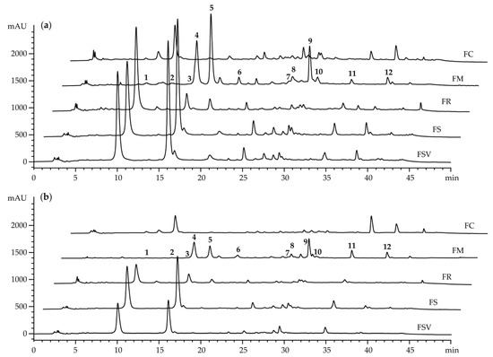 The HPLC method was employed to quantify and compare the major chemical constituents among the 100% methanol extracts of the stem bark of the four Fraxinus spp. and one variety collected during summer and autumn seasons. Twelve major peaks (1–12) were detected gradually at the retention times of 10.1, 13.4, 15.4, 15.9, 17.9, 21.1, 27.6, 28.6, 29.6, 30.8, 34.7, and 39.0 min (min) on HPLC chromatograms (Figure 5a,b).