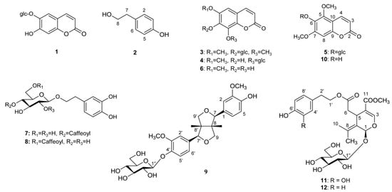 The chemical constituents consistent to major peaks were determined to be six coumarins of esculin (1), isofraxidin-7-O-β-D-glucopyranoside (3), fraxin (4), mandshurin (5), fraxetin (6) and fraxinol (10); three phenylethanoids of tyrosol (2), calceolarioside A (7), and calceolarioside B (8); two secoiridoids of oleuropein (11) and ligstroside (12); and a lignan, pinoresinol-4′-O-β-D- glucopyranoside (9) (Figure 6) (Figures S2–S37). These compounds have been isolated from the stem bark of F. mandshurica by our previously reported methods and used for the quantification as external standards [26].