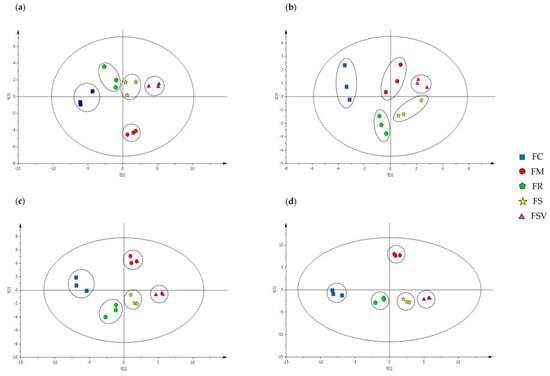 Orthogonal Projections to Latent Structures-Discriminant Analysis (OPLS-DA) multivariate statistical analysis of four Fraxinus species and variety: (a) anatomical data of leaves; (b) anatomical data of stem bark; (c) anatomical data of the leaves combined with anatomical data of stem bark; (d) anatomical data of leaf and bark combined with HPLC quantification data. FC, Fraxinus chiisanensis; FM, F. mandshurica; FR, F. rhynchophylla; FS, F. sieboldiana; FSV, F. sieboldiana var. angustata.