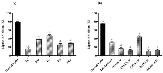 The anti-lipase activity of five Fraxinus plants and the fractions of FM: (a) percent lipase inhibition of five Fraxinus plants collected at summer season at 100 µg/mL; (b) percent lipase inhibition of total extract and five fractions from F. mandshurica bark at 100 µg/mL. Orlistat was used as a positive control. Different letters indicate significant differences based on one-way ANOVA followed by Tukey’s multiple comparison test (p < 0.05). FC, Fraxinus chiisanensis; FM, F. mandshurica; FR, F. rhynchophylla; FS, F. sieboldiana; FSV, F. sieboldiana var. angustata.