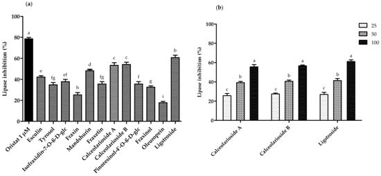 The anti-lipase activity of twelve compounds isolated from F. mandshurica: (a) percent lipase inhibition of the isolated compounds from F. mandshurica bark at the concentration of 100 μM. Orlistat was used as a positive control; (b) percent lipase inhibition of calceolarioside A and B, and ligstroside at three concentrations of 25, 50 and 100 μM. Different letters indicate significant differences based on one-way ANOVA followed by Tukey’s multiple comparison test (p < 0.05).