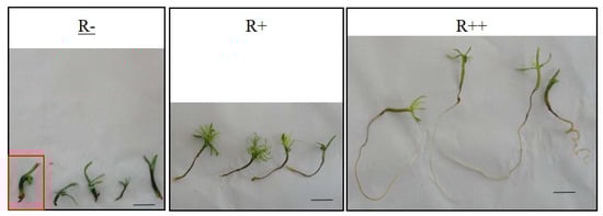 One week after germination, plantlets were transferred on fresh germination media supplemented with different concentrations of AlCl3 (up to 1 mM) and incubated for an additional eight weeks. On control medium (i.e., without added AlCl3), Douglas fir plantlets presented different types of morphology (Figure 1). Three categories of plantlets could be defined depending on the length of the roots. The first one, called “R−”, characterized by an absence of root (Figure 1, R−), represented about 40% of the population; the second category, “R+”, with roots less than 40-mm long, accounted for about 30% of the population; and the last category, called “R++”, presented longer roots (length ≥ 40 mm), and totaled about 30% of the population. In addition to the absence of root in the R− category, several anomalies were identified in the R+ group, such as symptoms of hyperhydricity of the needles and hardening of roots and stems (red box, Figure 1). For these reasons, further experiments and assays have only been conducted on plantlets belonging to the R++ category.