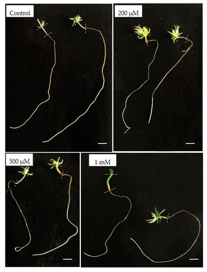 The presence of AlCl3, at a concentration as high as 100 µM in the germination medium, did not affect root or stem growth as shown by the phenotypic observations (supplementary data Figure S2). However, a significant inhibitory effect on root growth was observed in presence of a concentration 500 µM AlCl3. The average length of root was significantly reduced from 133 mm on the control medium to 104 mm (−21.8%) in the presence of a concentration of 500 µM AlCl3 (Figure 2 and Figure 3). Also, a significant decrease in stem length was observed in presence of a concentration of 500 µM of AlCl3 (−14.6%) as compared with the control. The average number of needles (12.04 needles per plant in control conditions) significantly dropped in presence of a concentration of 200 µM AlCl3 (9.8 needles per plant; −18.6%) but, surprisingly, an opposite trend was recorded with higher concentrations. Finally, in presence of a concentration of 1 mM AlCl3, this number was similar to what was seen in control conditions. It can be noticed that in the presence of a concentration of 1 mM of AlCl3, essentially, two phenotypes appeared: plantlets with a normal aerial part development (several needles) and plantlets with large and dark-green cotyledons but apparently devoid of developed needles (Figure 2).
