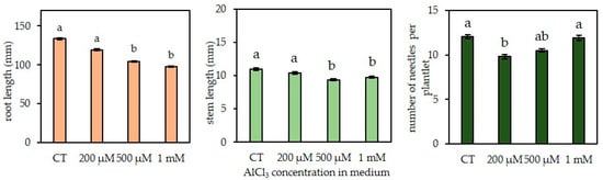 When exposed to AlCl3, the growth and development Douglas fir somatic plantlets showed no alteration up to a concentration of 100 µM. However, in the presence of a concentration of 200 µM and higher concentrations of AlCl3, we observed significant drops in root and stem dry mass, along with a decline in the number of needles. This result is similar to the study on Pinus thumbergii seedlings that exhibited no significant reduction in mass when treated with a concentration of less than 500 µM Al over 18 days []. Also, no effect on the plant growth of Picea rubens plantlets was observed when the concentration of Al was lower than 250 µM []. Nevertheless, the majority of the plant models described in the literature did not seem to withstand such high amounts of AlCl3. For example, the inhibition of root elongation of maize plantlets could be observed in the presence of AlCl3 concentrations in the culture medium as low as 25 μM []. Wheat root structure and growth were significantly altered when exposed to a concentration of 5 µM AlCl3 for four days []. A 40% inhibition of root growth was observed in red oak (Quercus rubra) in the presence of a concentration of 115 µM Al in hydroponic solution [].