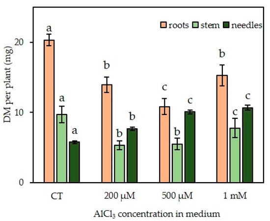 Effect of AlCl3 concentration (range: 0–1 mM) in culture medium on the average dry mass (DM) of various organs of in vitro-grown R++ Douglas fir somatic plantlets. For each harvest, the same organs of all somatic plantlets grown in the same condition were gathered for better accuracy. Organs were then lyophilized and weighed. Each bar of the histogram represents the mean and standard deviation (SD) of 13 independent experiments, each with 20 plantlets. Different letters indicate significant differences between exposure conditions (p < 0.05), ANOVA test. n = 13 (mean +/− SD). R++ plantlets showed a root length > 40 mm after one week of growth on germination medium. CT: Control treatment.
