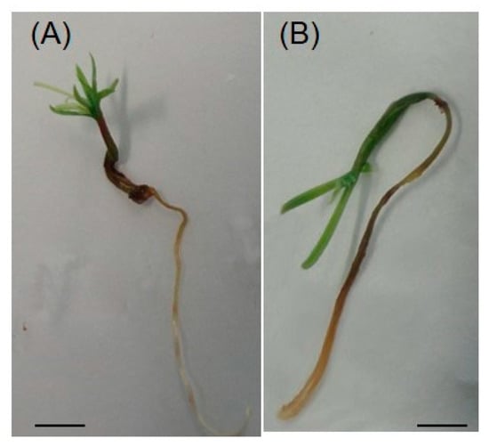 Symptoms of hyperhydricity of Douglas fir somatic plantlets cultured in vitro. (A) An R ++ plantlet grown in presence of a concentration of 500 µM AlCl3 having a normal appearance. (B) An R ++ plantlet at a concentration of 500 µM showing vitreous needles and stem. R++ plantlets showed a root length > 40 mm after one week of growth on germination medium. Bar: 1 cm.