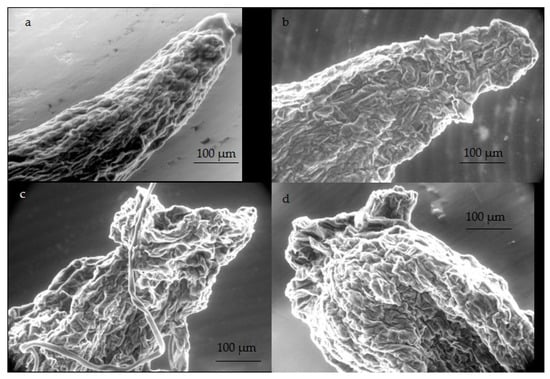 As the main phenotypic effect of Al toxicity concerned root growth, SEM observations of root tips were performed. Figure 6 shows alterations caused by an exposition to Al: the sharp, tapered shape of the apical zone of the control root (Figure 6a) led to a distorted and cracked ending in presence of a concentration of 1 mM AlCl3 (Figure 6c). Actually, the overall shape of the root apex was not significantly altered in presence of a concentration of 200 µM AlCl3 (Figure 6b). The root still presented a tapered tip, but started to make a small curl, which was more apparent in presence of a concentration of 500 µM AlCl3 (Figure 6c), along with presenting a rough surface.