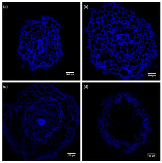 Confocal microscopy images of root cross sections of Douglas fir R ++ somatic plantlets at 10 mm of root tips, dyed with Calcofluor. Plantlets were grown for eight weeks in germination medium (a: Control), or in germination medium supplemented with different concentrations of AlCl3: (b) 200 µM, (c) 500 µM, (d) 1 mM. Several samples were observed, and the samples presented in this figure are each one representative of their batch. R++ plantlets showed a root length > 40 mm after one week of growth on germination medium.