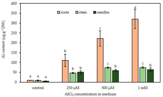Also, it can be noticed that Al content of each organ increased with Al concentration in the germination medium. Al content of roots increased from 9.6 μg Al g−1 DW in control conditions to 320 μg Al g−1 DW in the presence of a concentration of 1 mM AlCl3. Under the same conditions, the stem contents varied from 9 μg Al g−1 DW to 74.7 μg Al g−1 DW and from 5.2 μg Al g−1 DW to 63.6 μg Al g−1 DW for the needles.