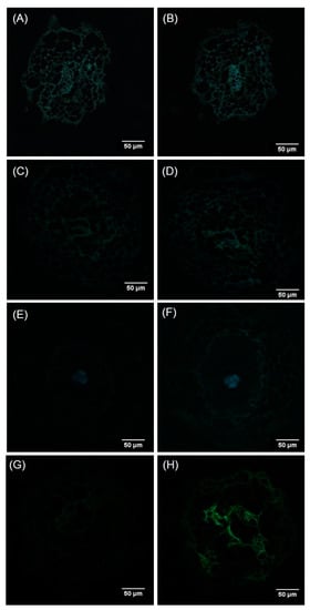Al localization with Morin staining of root cross sections of Douglas fir somatic plantlets at 10 mm from the root tip. (A) Autofluorescence of plantlets grown under control conditions, or (C,E,G) in culture media supplemented with different concentrations of AlCl3 (200 µM, 500 µM and 1 mM, respectively). Fluorescence of Morin-stained samples: (B) Plantlets grown under control conditions, or (D,F,H) in culture media supplemented with different concentrations of AlCl3 (200 µM, 500 µM and 1 mM, respectively).