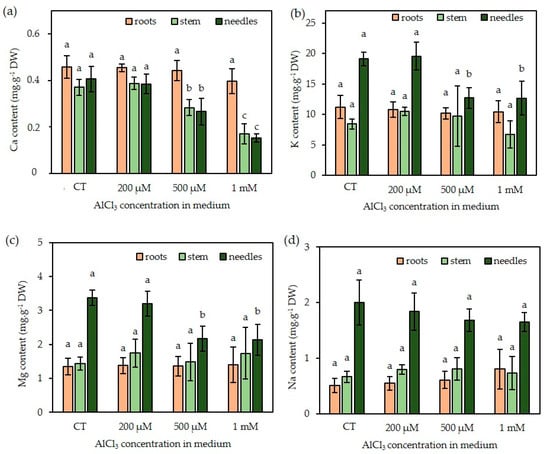 Mineral content of roots, stems and needles of Douglas fir somatic plantlets exposed to concentrations of 0–1 mM AlCl3. (a): Ca, (b): K, (c): Mg, (d): Na (contents expressed in mg g−1 DW). Each bar of the histogram represents the mean and standard deviation of four independent experiments, each with 10 plantlets. Different letters indicate significant differences between exposure conditions (p < 0.05), ANOVA test. n = 4 (mean +/− SD).