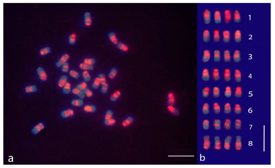Self-genomic in situ hybridization (sGISH) banding in chromosomes of M. sativa subsp. sativa displaying the localization of highly repeated DNA sequences (satDNA). (a) Mitotic metaphase after the sGISH treatment; (b) karyogram of the sGISH-banding metaphase shown in Figure 1a; the chromosomes were arranged according to their morphological traits and the sGISH signal pattern. The bar represents 5 µm.