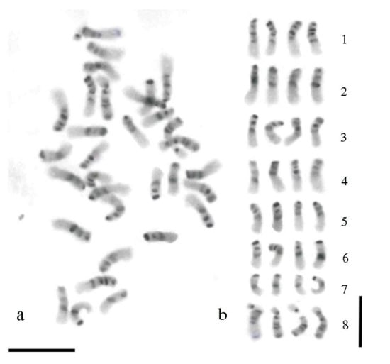 C-banding in the tetraploid alfalfa. (a) Mitotic metaphase chromosomes after the C-banding treatment and Giemsa staining; (b) karyogram according to Figure 1a; chromosomes were arranged according to their morphological traits and distribution of the heterochromatic bands. The bar represents 5 µm.
