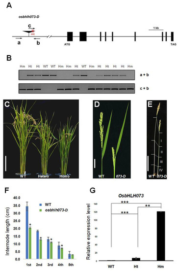 Phenotype of osbhlh073-D plants and the expression level of OsbHLH073. (A) Schematic diagram of the OsbHLH073 gene structure and relative T-DNA insertion positions. Black boxes denote exons. 4XE denotes four tandem copies of CaMV 35S enhancer. Primers (a, b, and c) used for genotyping. (B) Genotyping analysis of osbhlh073-D plants. WT, Ht, and Hm mean wild-type segregant, heterozygote, and homozygote for T-DNA insertion, respectively. (C) Phenotype of wild-type, heterozygous, and homozygous plants. Bar = 20 cm. (D) Panicle exsertion phenotype of wild-type and osbhlh073-D (073-D) plants. Bar = 5 cm. (E) Photograph showing internode length of wild-type and osbhlh073-D (073-D) plants. Bar = 20 cm. (F) Average internode length of wild-type and osbhlh073-D plants. Data are mean ± standard deviation (SD) from at least 10 plants. (* p < 0.001, Student’s t-test) (G) Relative expression level of OsbHLH073 in wild-type, heterozygous, and homozygous plants. Expression levels were normalized to Actin (LOC_Os03g50885) (** p < 0.01, *** p < 0.001, Student’s t-test).